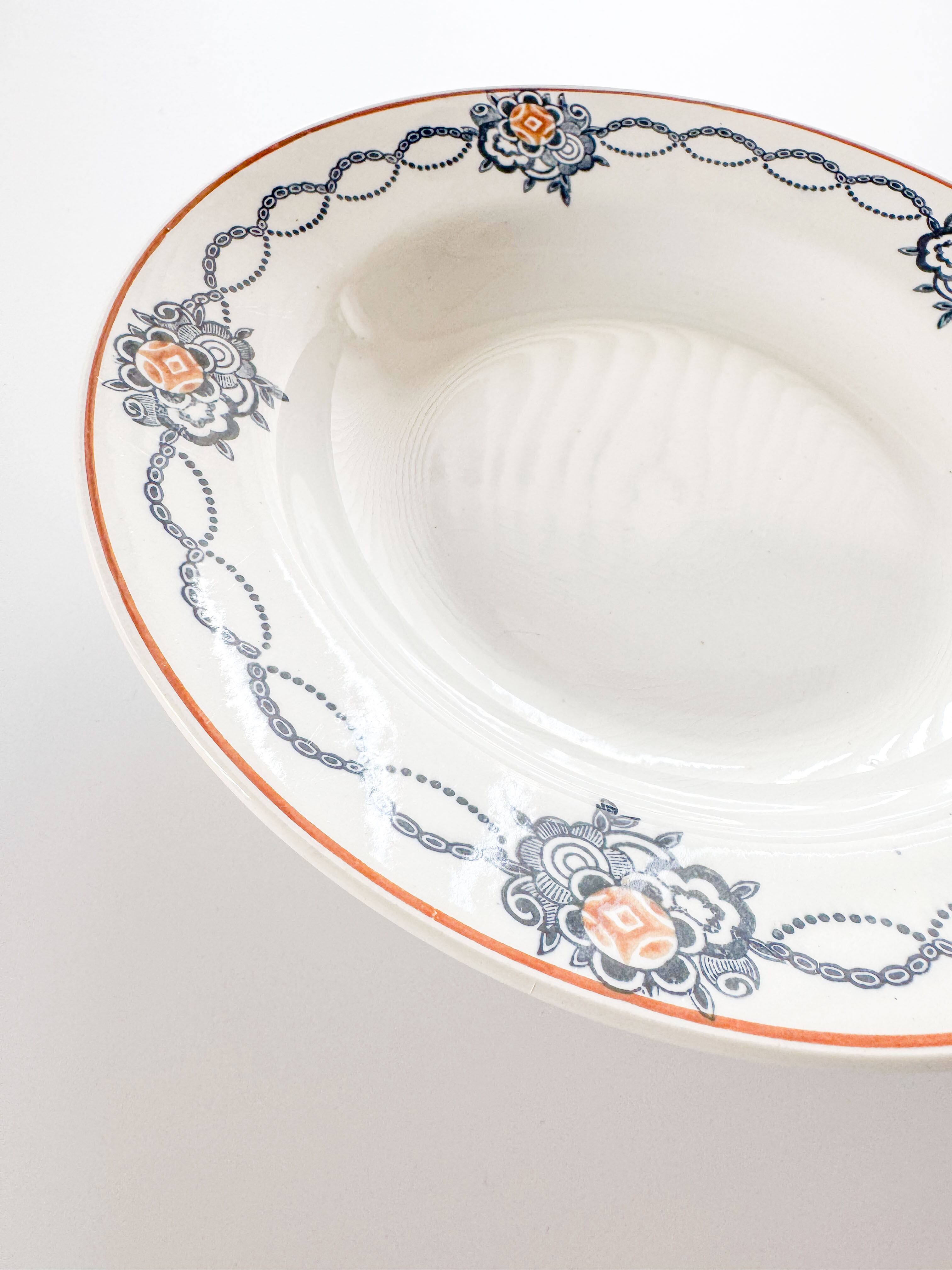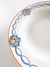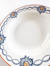 オレンジと青で描かれた、オリエンタルな絵柄が神秘的で素敵な深皿です。