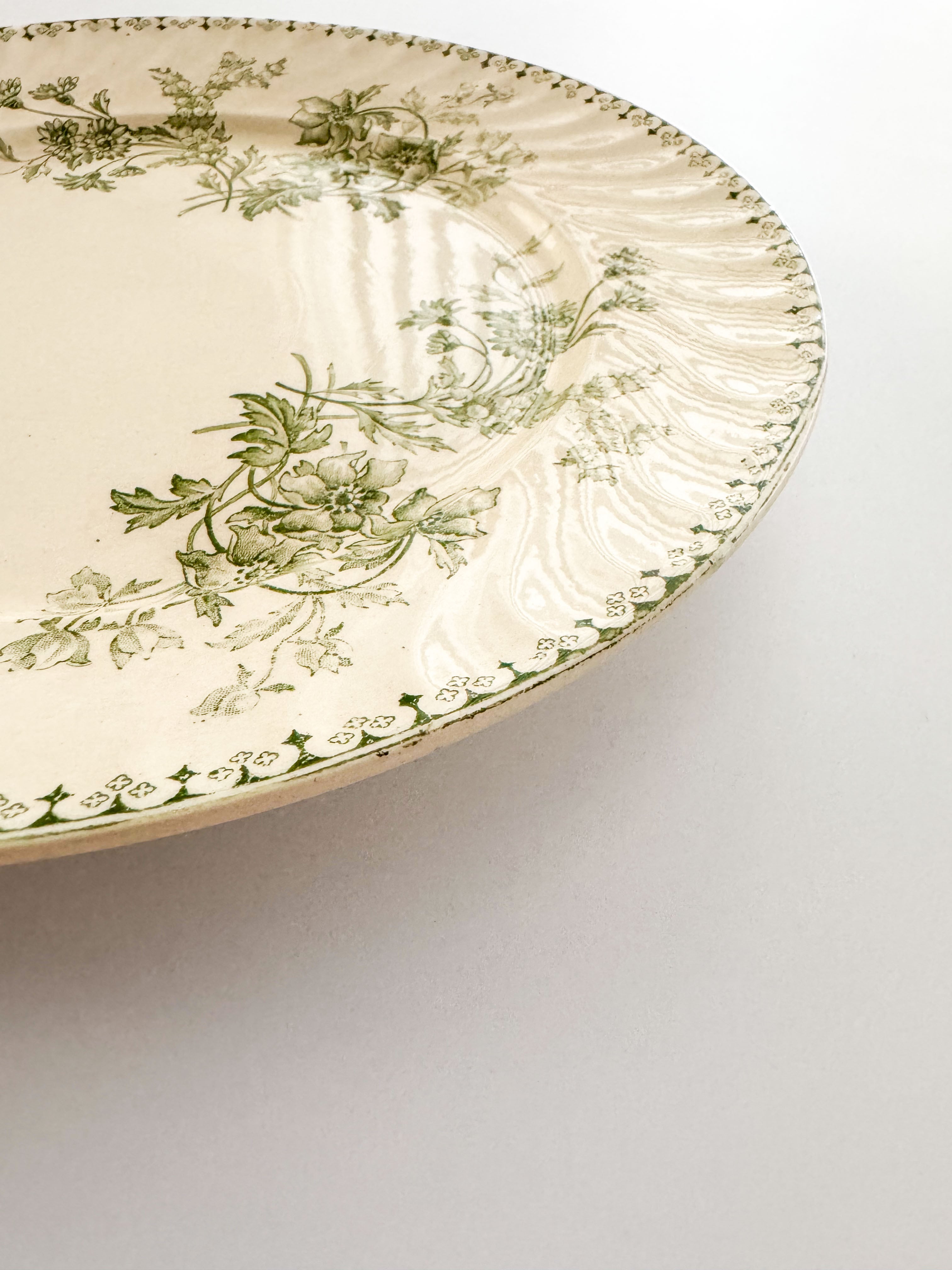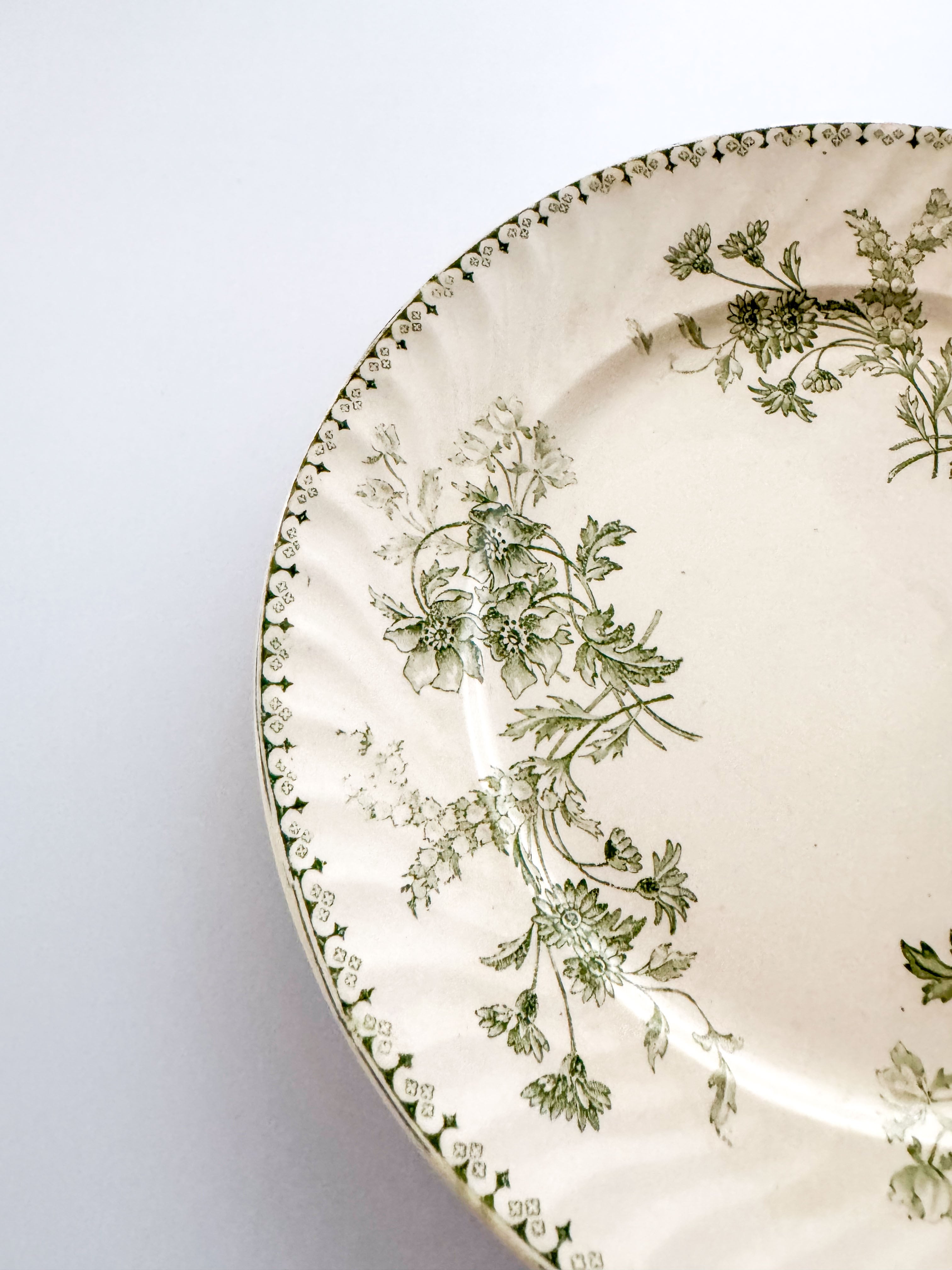 縁は波状のレリーフで装飾され、グリーンで繊細な野バラなどが描かれたかわいらしいデザイン。