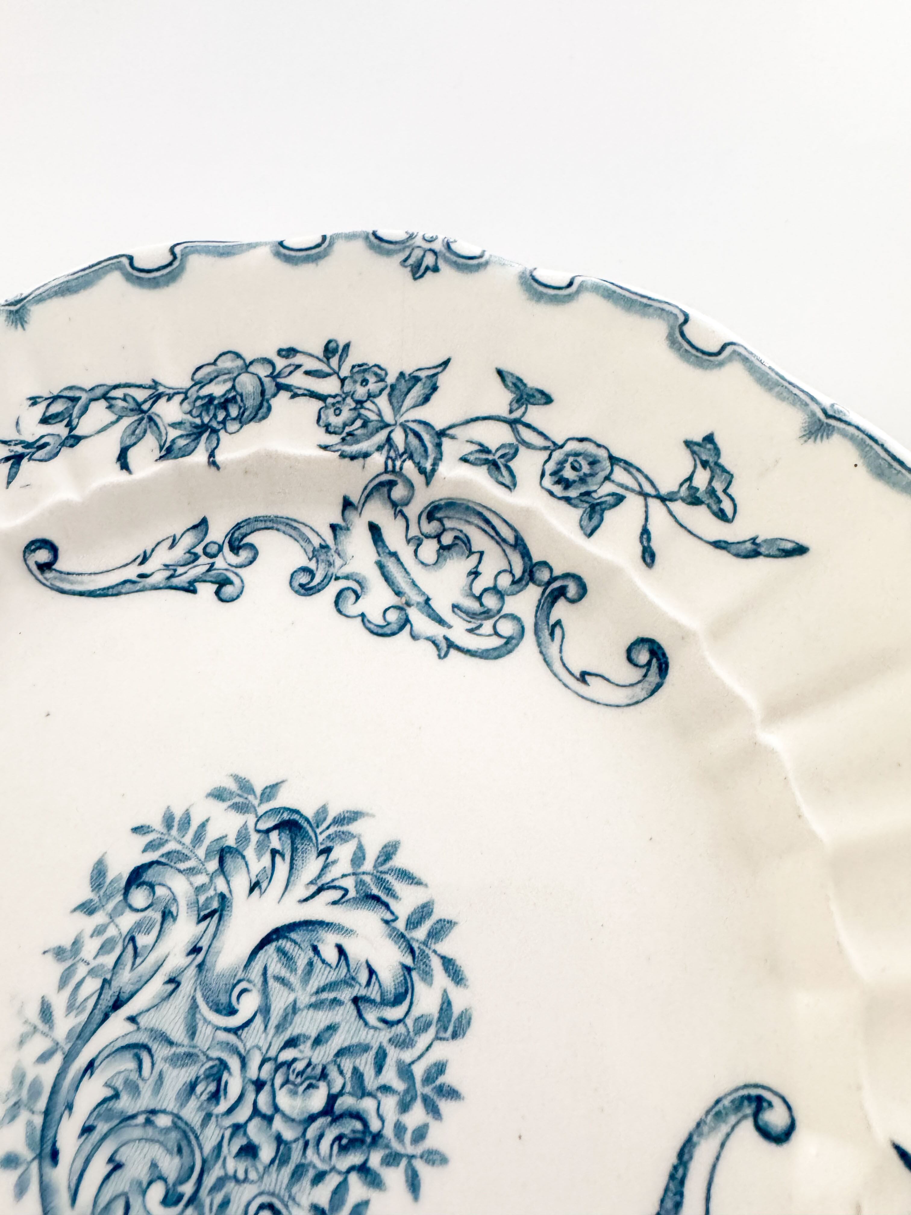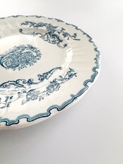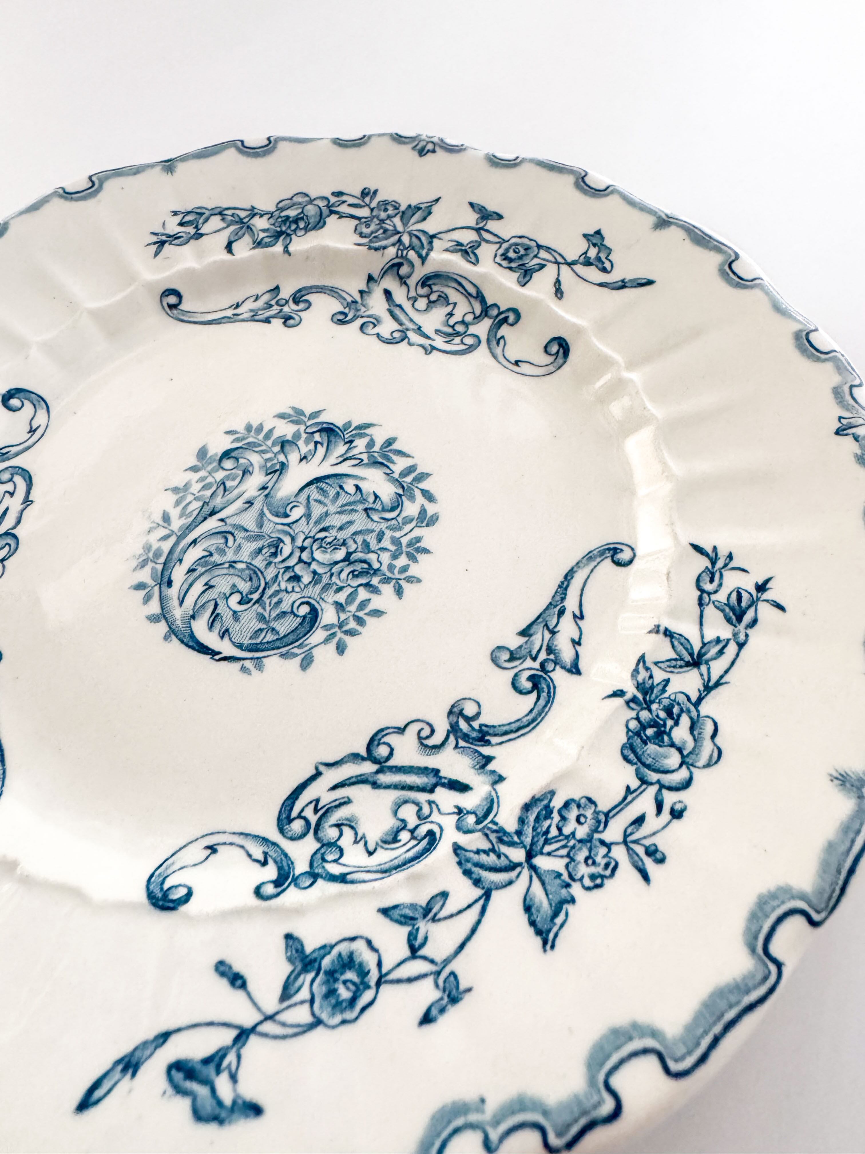 青色のロカイユ模様が特徴で、波打ったリムが優雅な雰囲気の一枚。