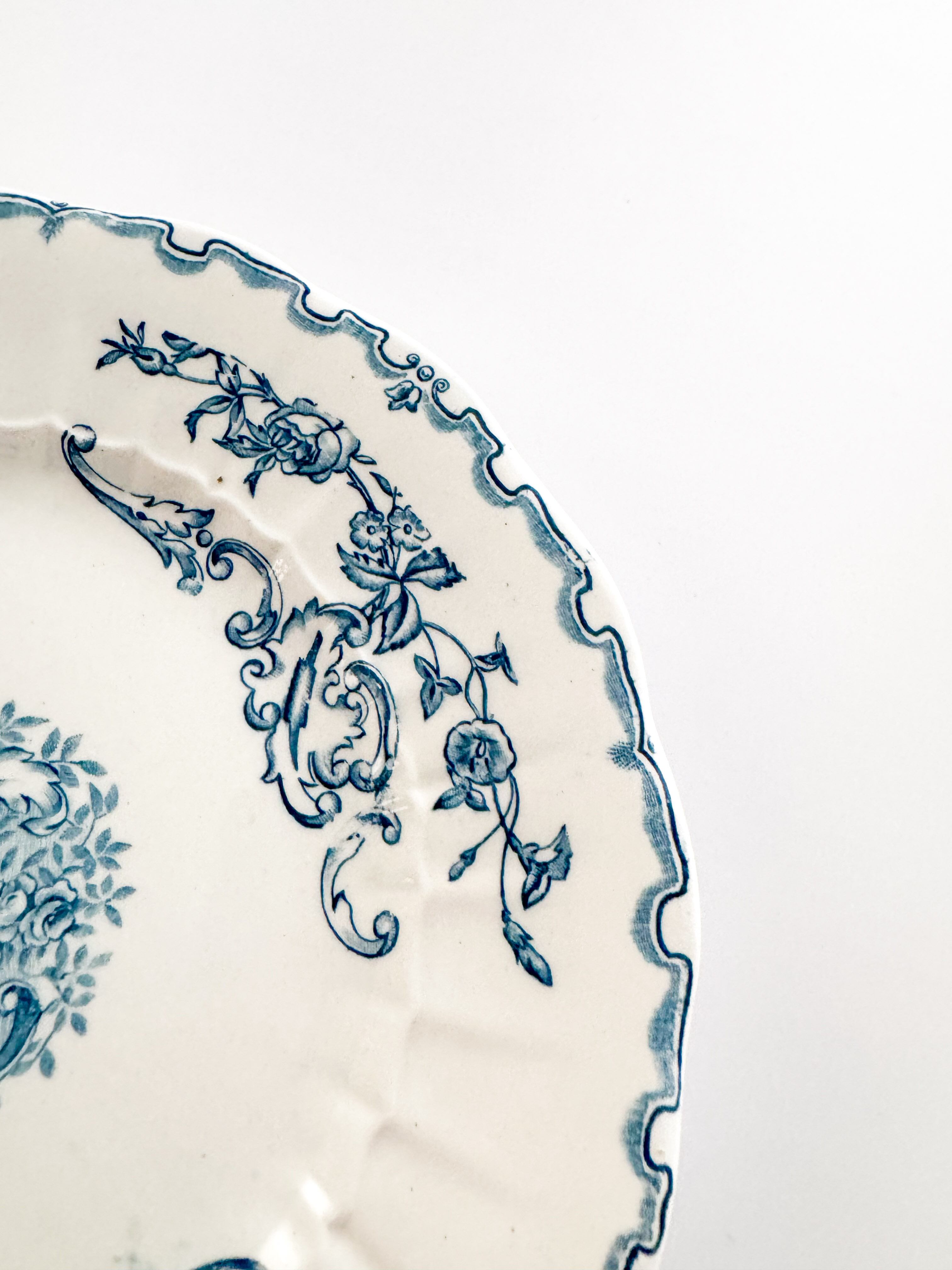 青色のロカイユ模様が特徴で、波打ったリムが優雅な雰囲気の一枚。