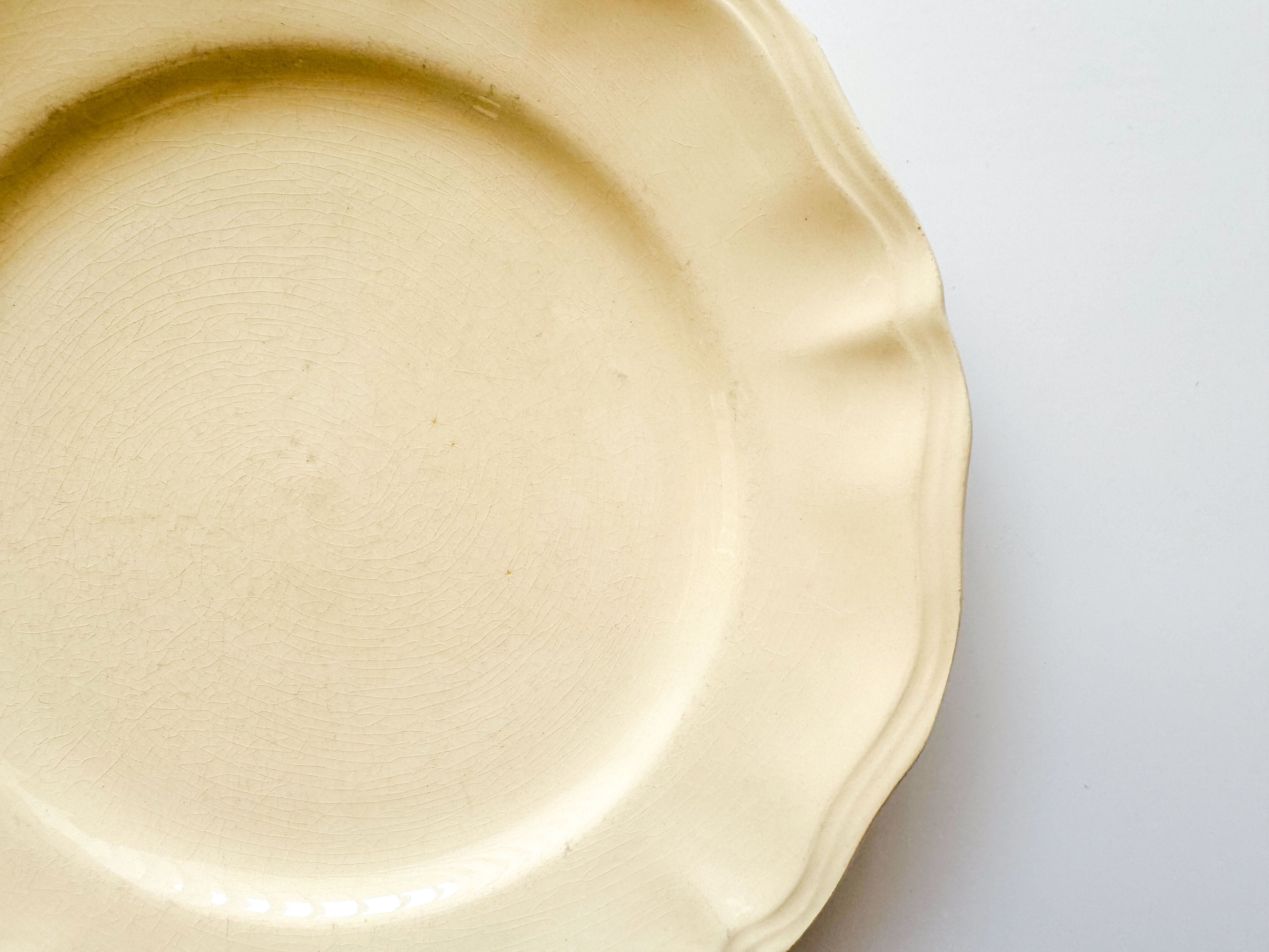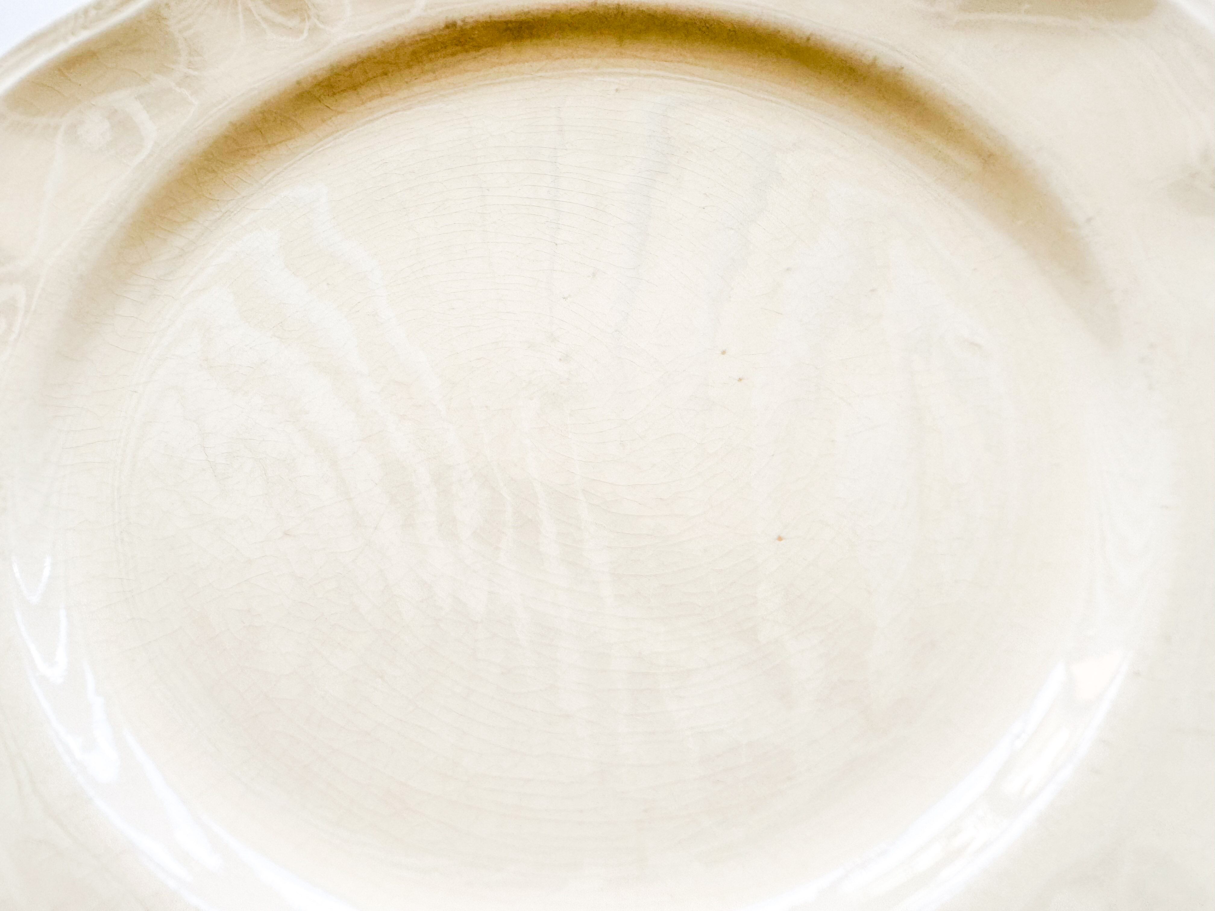 お皿の縁周りには波打つようなラインで囲まれ、花びらをモチーフとしたような立体的かつ流麗な姿が際立ちます。アイボリー色になったどこか温もりを感じさせてくれるようで、艶やかな質感なのも卓上に気品をもたらしてくれそうです。