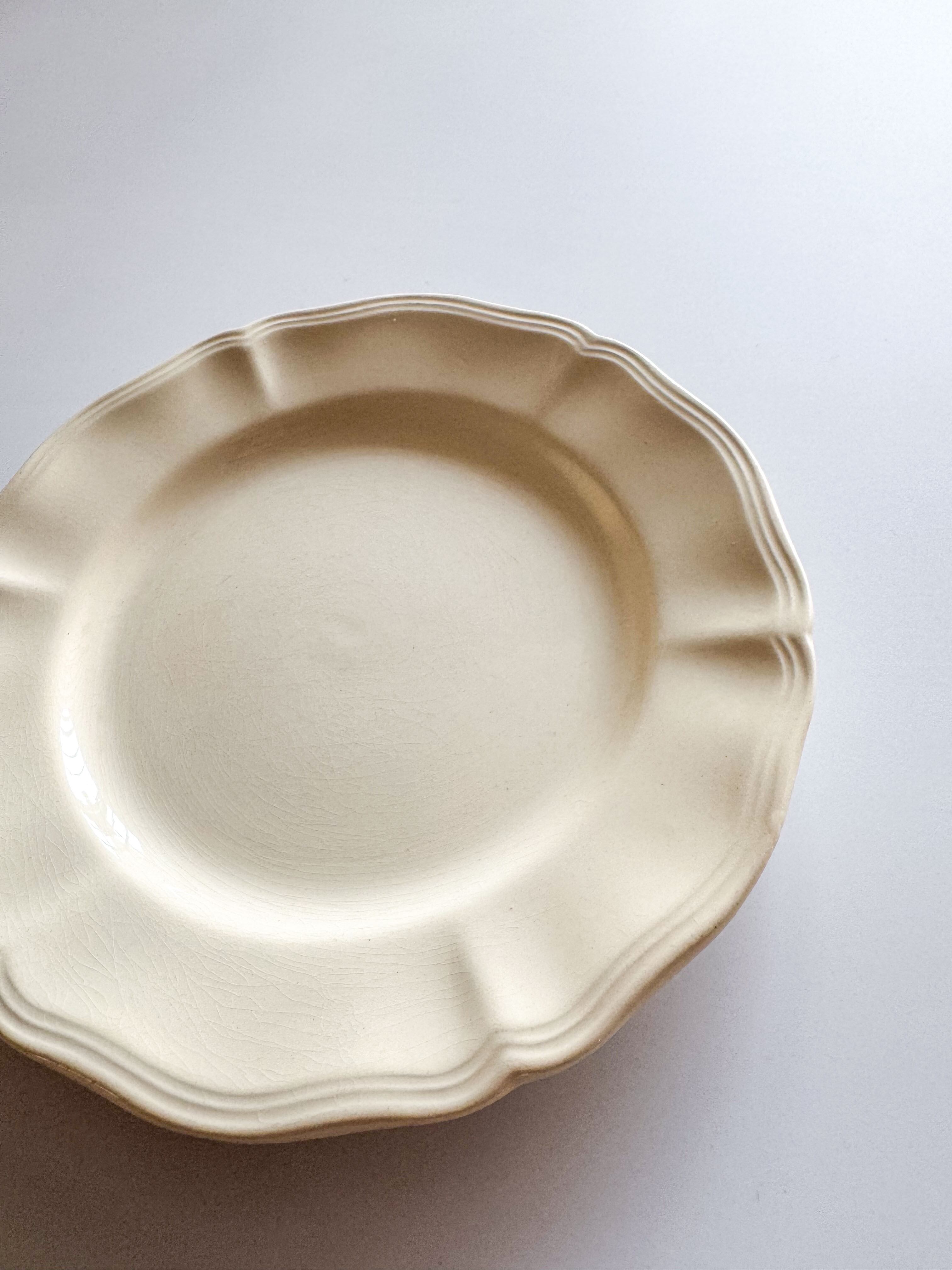 お皿の縁周りには波打つようなラインで囲まれ、花びらをモチーフとしたような立体的かつ流麗な姿が際立ちます。アイボリー色になったどこか温もりを感じさせてくれるようで、艶やかな質感なのも卓上に気品をもたらしてくれそうです。