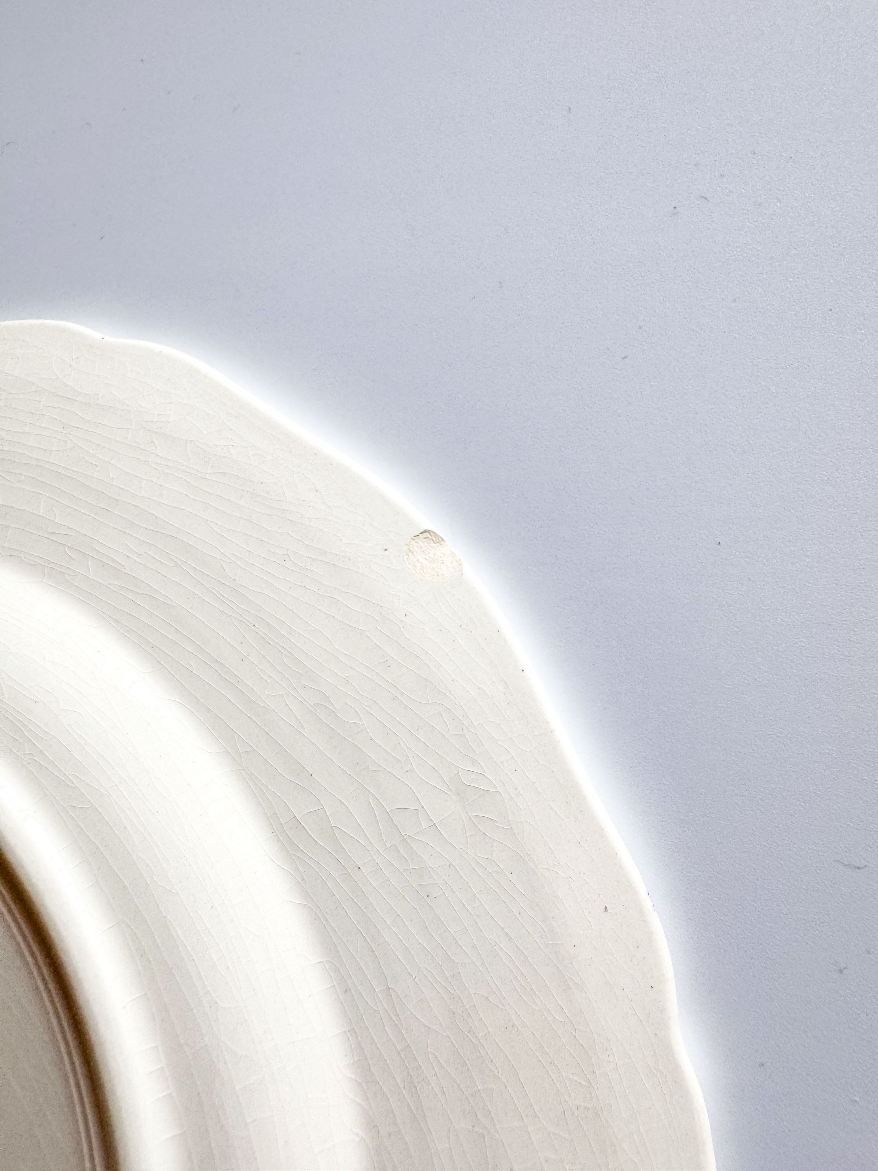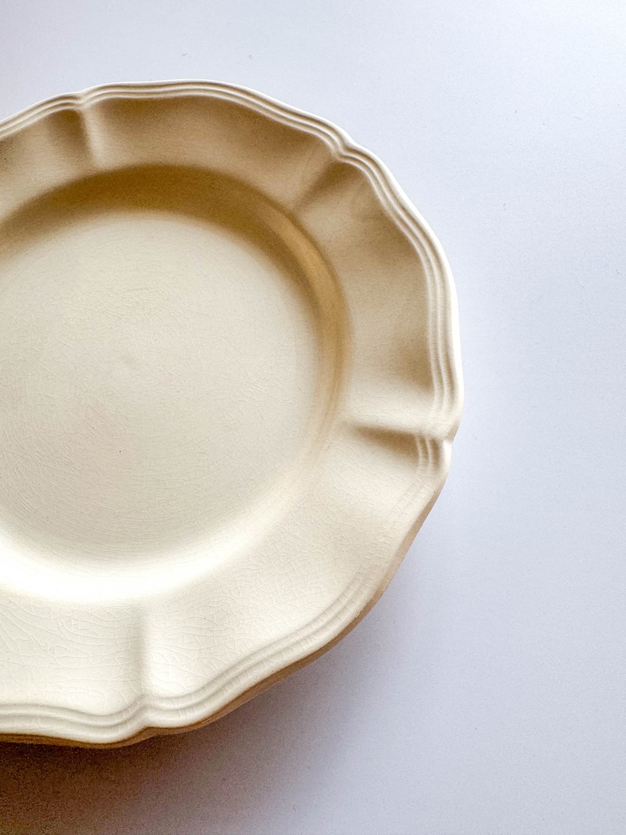 お皿の縁周りには波打つようなラインで囲まれ、花びらをモチーフとしたような立体的かつ流麗な姿が際立ちます。アイボリー色になったどこか温もりを感じさせてくれるようで、艶やかな質感なのも卓上に気品をもたらしてくれそうです。