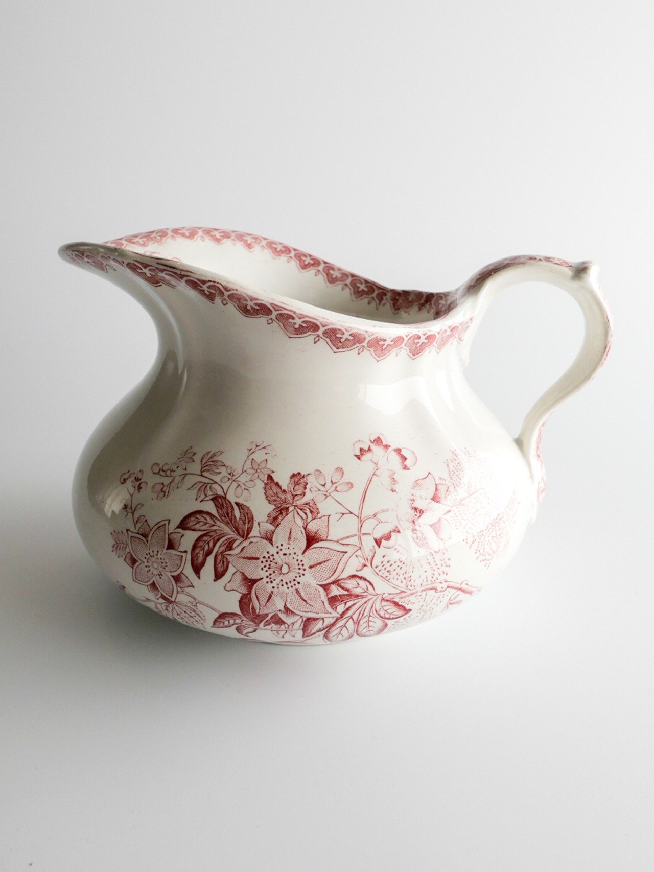 赤いカラーで描かれたクラシカルで上品な花柄の絵付けが美しいピシェ(水差し)。